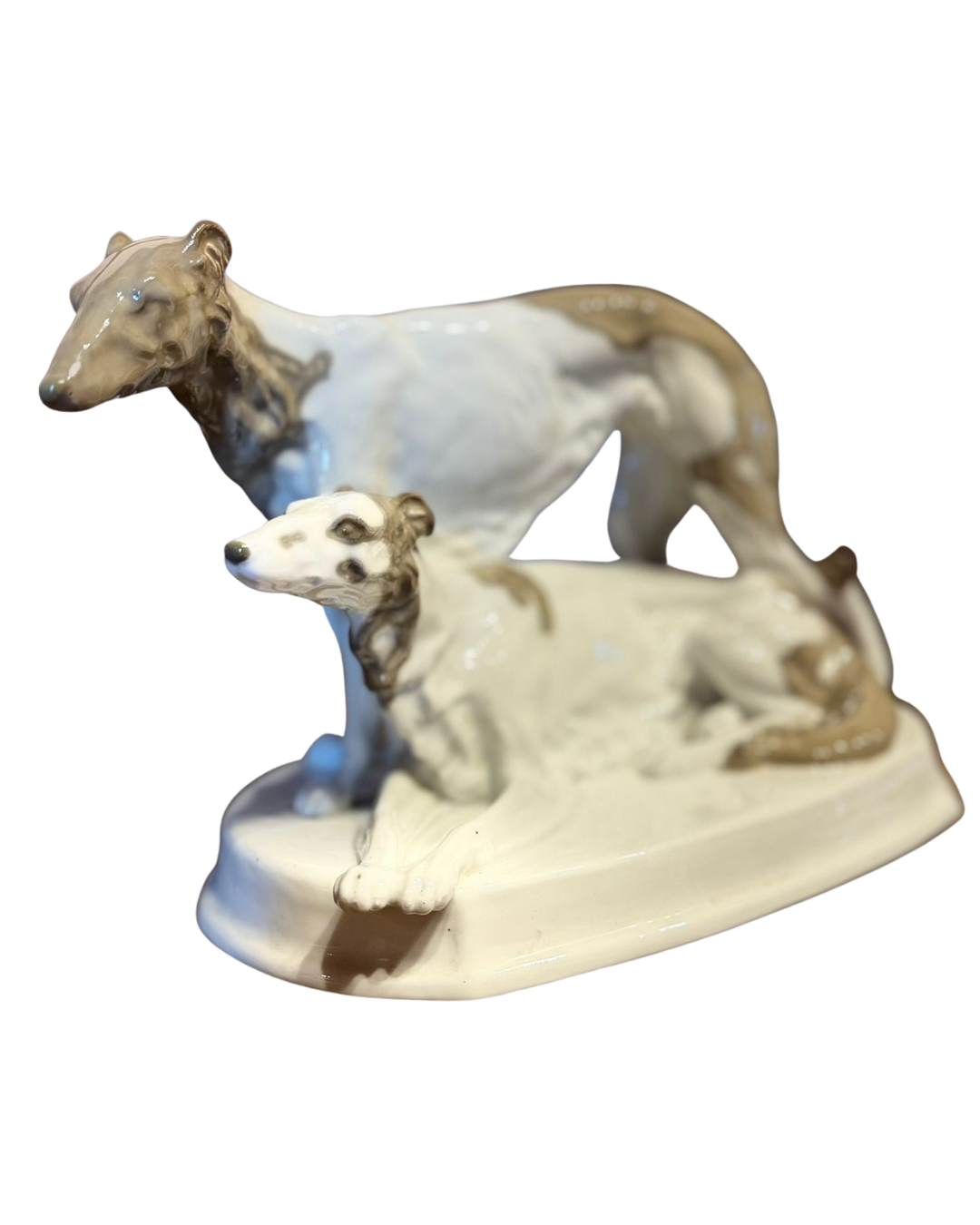 Yaklaşık 1900 yılında Almanya’nın porselen merkezi Meissen kasabasında, Carl Teichert atölyelerinde Art Nouveau dönemi estetiğiyle üretilen bu nadir eser; oval bir kaide üzerinde birinin vakurca uzandığı, diğerinin ise tetikte beklediği ikili Borzoi (Rus Tazısı) figüründen oluşmaktadır. 22 cm yükseklik, 27 cm genişlik ve 15 cm gövde derinliğine sahip olan bu heybetli çalışma, beyaz porselen üzerine uygulanan bölgesel kahverengi sır detaylarıyla Borzoi cinsinin ipeksi ve asil tüy yapısını ustalıkla betimler. 120 yılı aşkın tarihiyle Avrupa porselen sanatının realizm akımını yansıtan bu parça, Carl Teichert’in tescilli damgasıyla mühürlenmiş olup, gerek anatomik doğruluğu gerekse geniş formuyla hem dekoratif hem de koleksiyon değeri yüksek bir sanat objesidir.