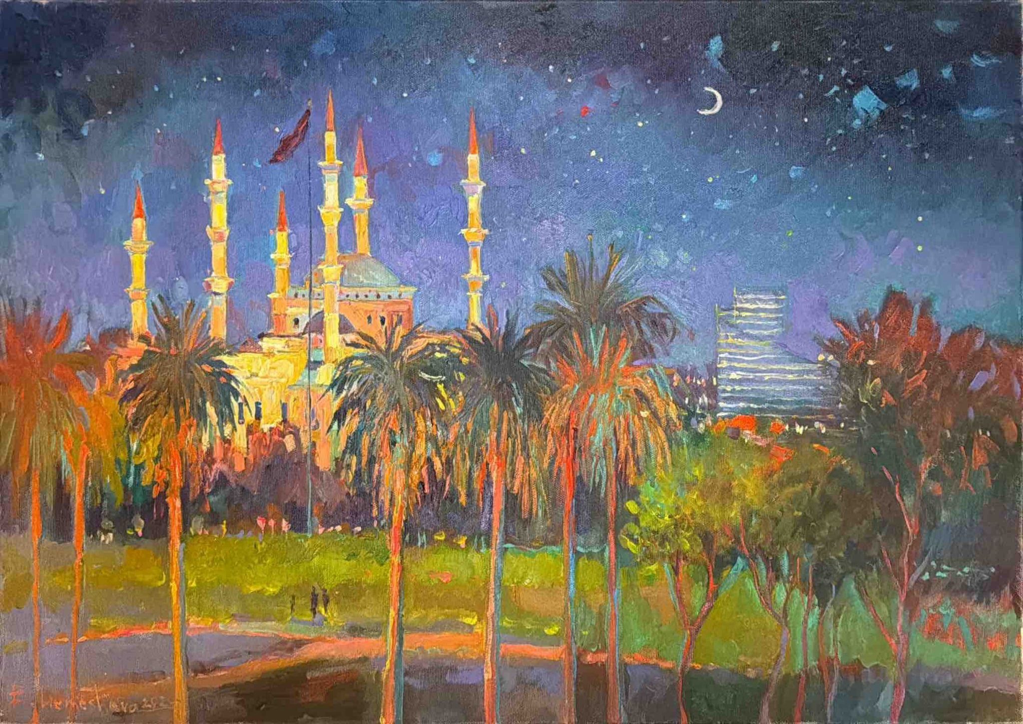 ”Adana’nın ikonik Sabancı Merkez Camii’ni yıldızlı bir gökyüzü ve palmiye ağaçlarının huzurlu gölgesinde betimleyerek; kentin tarihi dokusunu, spiritüel derinliğini ve Akdeniz akşamlarının büyüleyici atmosferini canlı bir renk paletiyle sunar.”