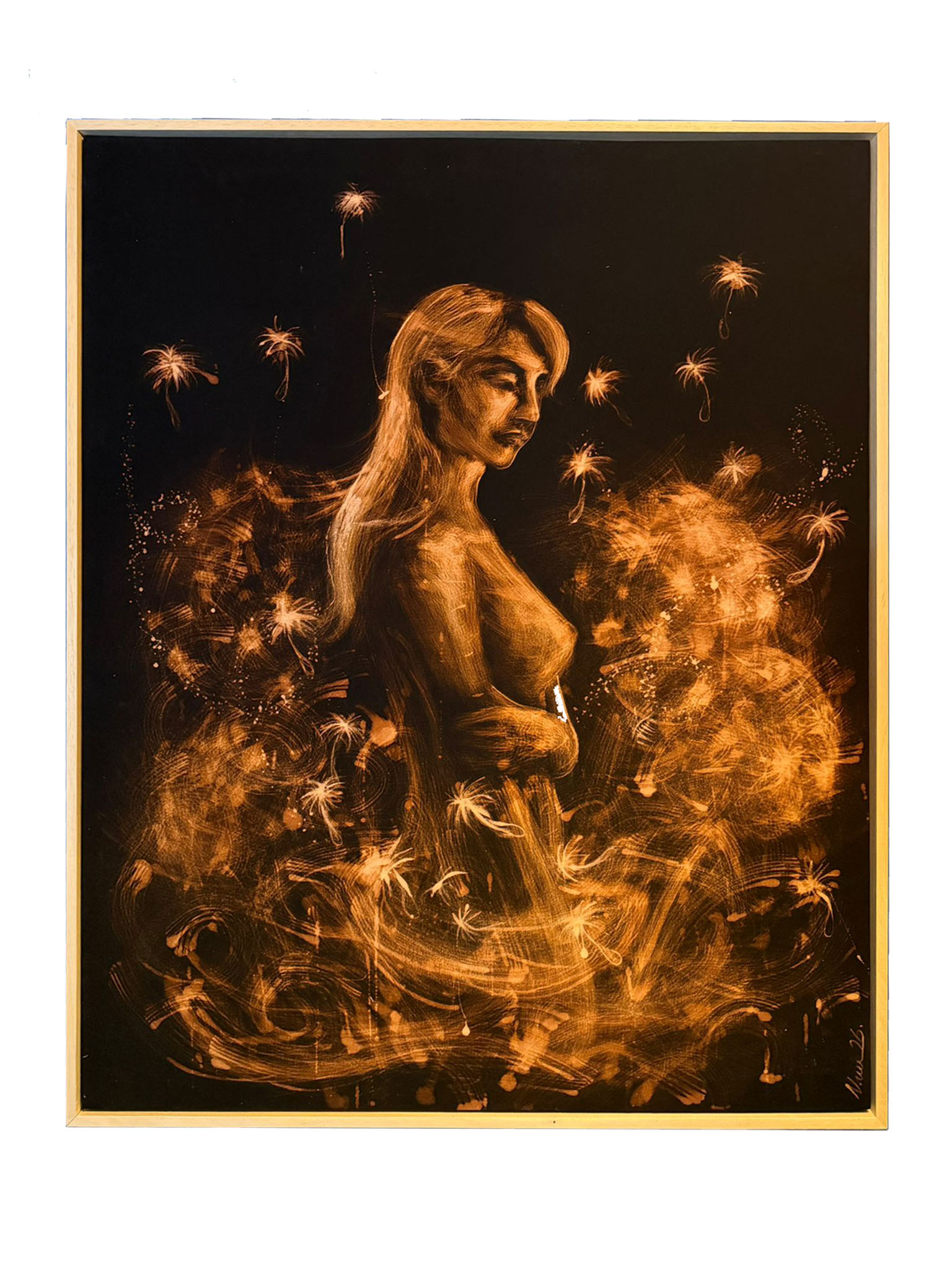 ”Yolculuklar arası mutlak bir durma hali. Figür; rüzgarla sürüklenip başka zeminlerde kök salan karahindiba hareketliliği içinde, kendi sessizliğini bir koza olarak inşa eder. Bu güvenli alan, kumaşın katman katman ağartılarak maddeden arındırılmasıyla kurulur. Kimyasal tepkimeyle sağlanan ışık, dışsal akışın ortasındaki merkezlenme durumudur.”